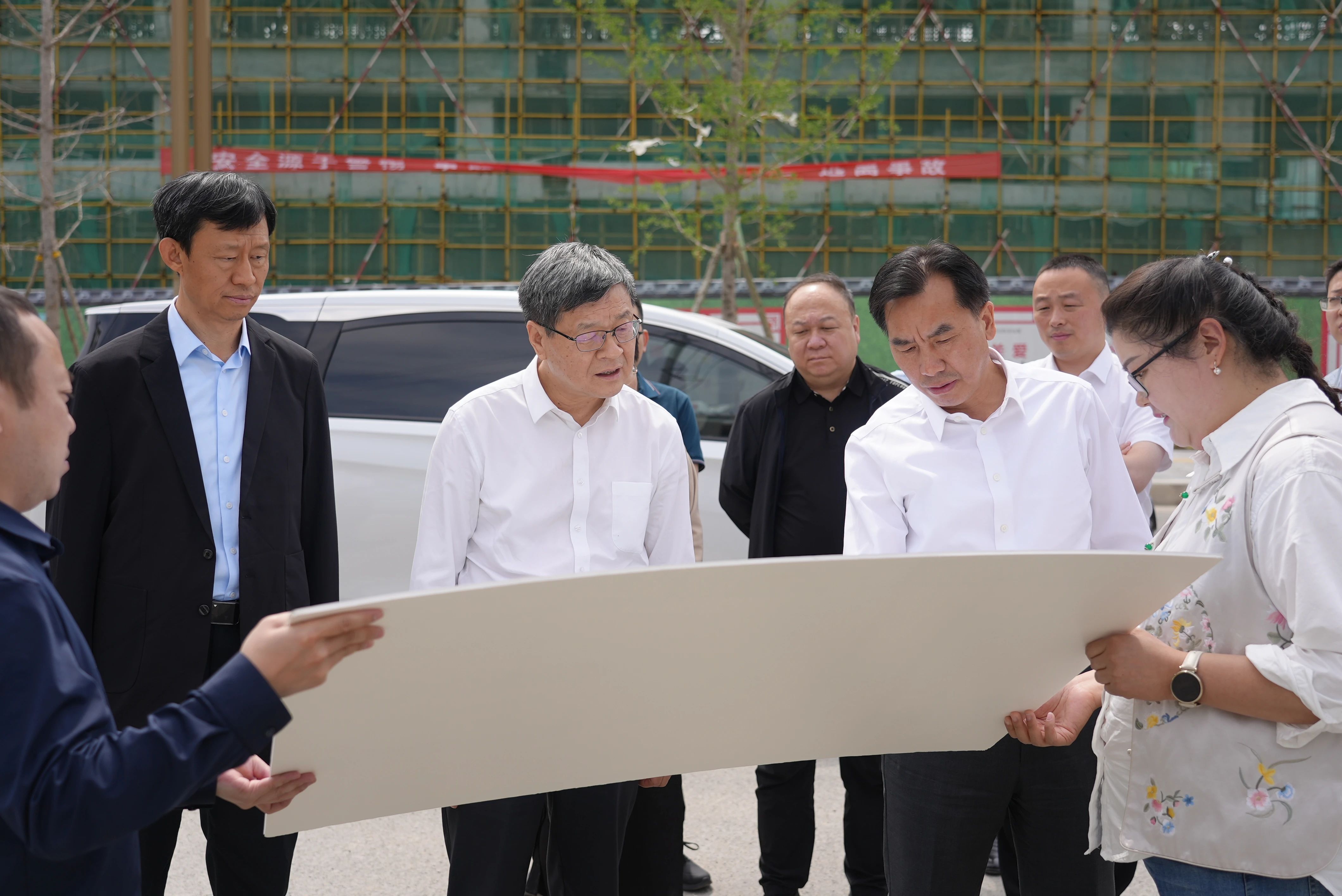 罗乾宜一行来到朝天区金堆新区初级中学“国机宿舍楼”项目建设现场,认真听取由集团下属企业中国联合帮扶完成的金堆新区城乡规划思路和推进情况汇报。2023年,围绕改善基础设施、提升公共服务水平,国机集团帮扶朝天区编制了乡村振兴全域发展规划,提出“产业先行,城乡联动”的乡村振兴发展思路,推动构建城市—枢纽镇—支点村三级联动的乡村振兴发展体系,得到广元市、朝天区政府的高度认可。