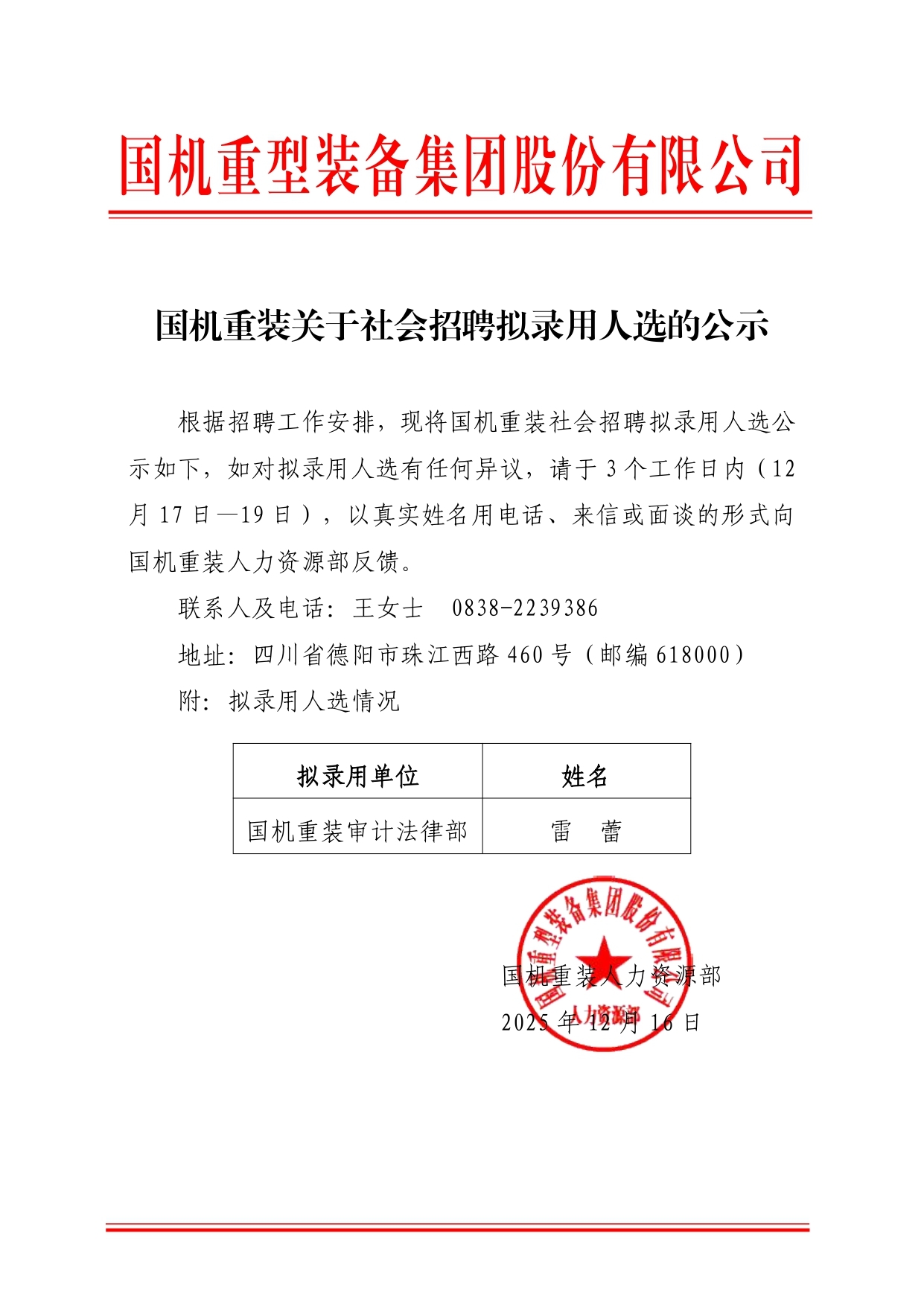 国机重装关于社会招聘拟录用人选的公示